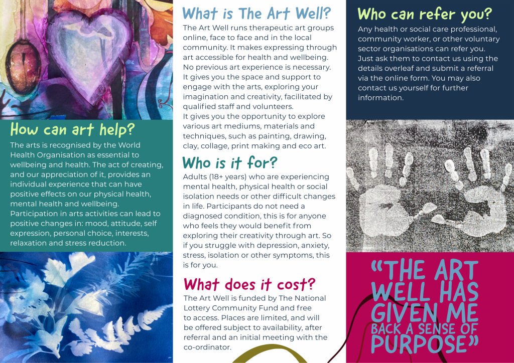The Art Well is a therapeutic arts for health group, supporting mental health and wellbeing through creativity. We are now running groups both online and face to face.